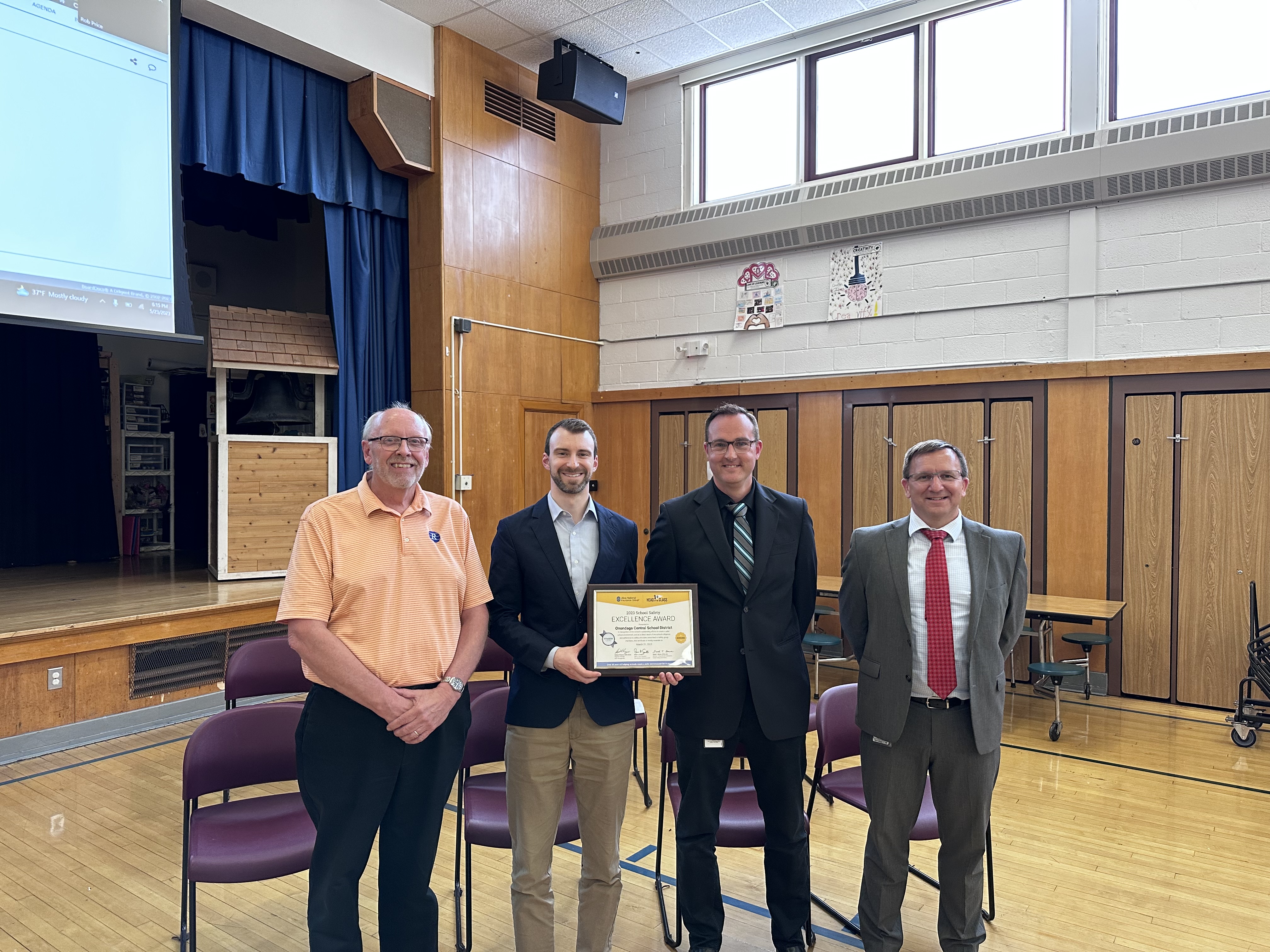 At the Board of Education Meeting on Tuesday May 23, 2023, the Onondaga Central School District was awarded the School Safety Excellence Award by Utica National Insurance Group. It was presented by Sean Reagan and Joe Campbell from the Reagan Companies. This award signifies OCS’ dedication to providing a safe, healthy and focused culture for learning in 2021. This is the seventh consecutive year that OCS has earned the top award. Many thanks to all faculty and staff who continue to dedicate their efforts to make Onondaga safe, while focusing on preparing contributing citizens for life.